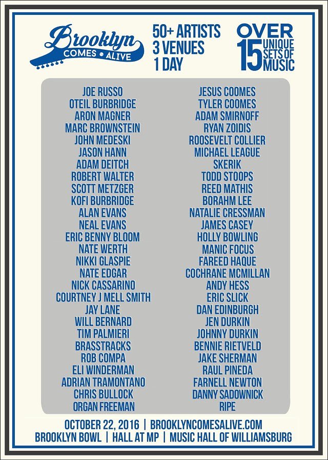 On Saturday, October 22nd, 50 different artists will perform across three venues at Brooklyn Comes Alive. Purchasing a ticket to Brooklyn Comes Alive gets you a wristband that allows access to three venues: Brooklyn Bowl, Music Hall of Williamsburg, and The Hall at MP. Wristband-holders can come-and-go from all three venues throughout the event, jumping back and forth to catch their favorite bands.