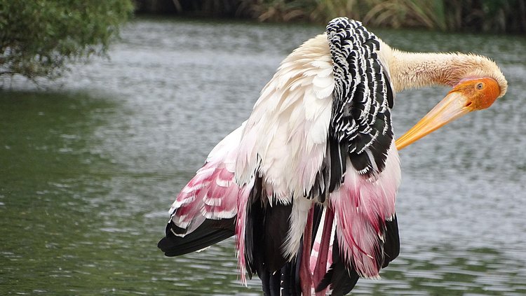 Painted storks are large wading birds native to tropical regions of Asia. They are named for their striking black, white, and pink wing feathers, orange beaks, and pink legs. The rest of the plumage is largely white.