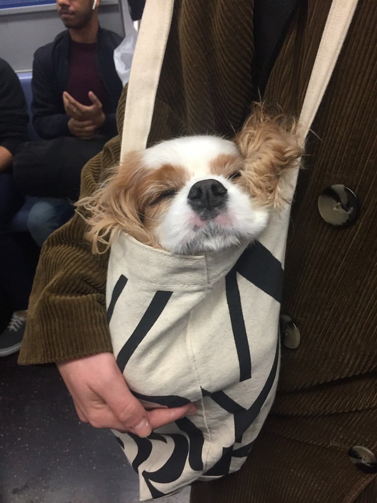 Local Redditor Baronvonrosschild recently captured this cute photo of a sleepy, older dog hanging out inside of a tote bag on the New York City subway, following all the rules to a T. What a cutie!