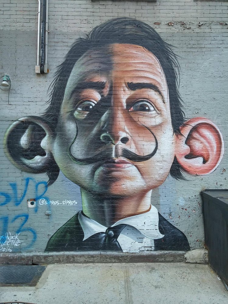 Brazilian street artist Sipros is well known for his portraiture of exaggerated characters mainly painted on city walls as colorful murals. One of his best pieces is in Murray Hill on 35th Street and 2nd Avenue, featuring Spanish surrealist Salvador Dalí with his iconic mustache and an extra large set of ears.