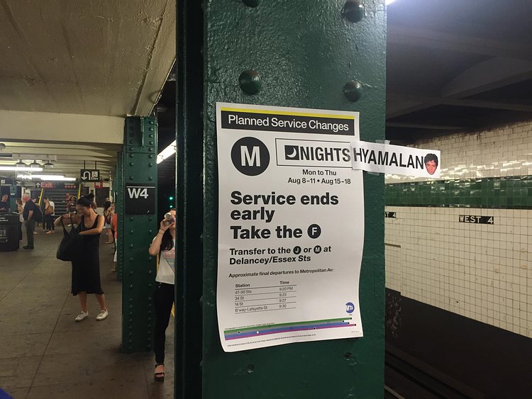Some clever pranksters recently added a little to the Planned Service Change announcement flyers in the West 4th St subway station. The announcement regarded the M line during nighttime operation and had the heading "M Nights", so of course, the pranksters turned it into M. Night Shyamalan