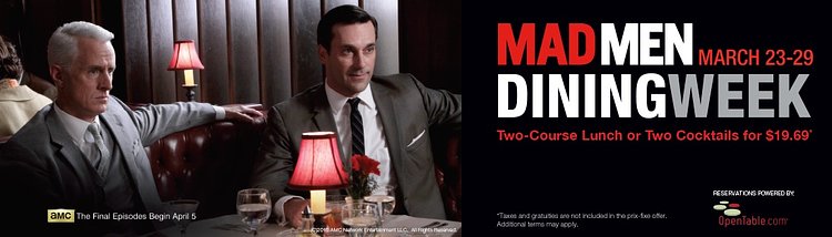 Mad Men era, will be offering appropriately priced $19.69 prix fixe, 2 course meals, or 2 specialty cocktails for the price. The special deals are only valid until March 29th, so be sure to make your reservations today before they fill up.