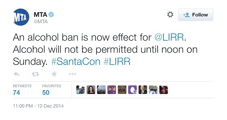 Because there exists a crowd who would rather be at SantaCon than today's Million March NYC, the MTA has banned alcohol on it's trains for 37 hours until Sunday. Here is the press release.