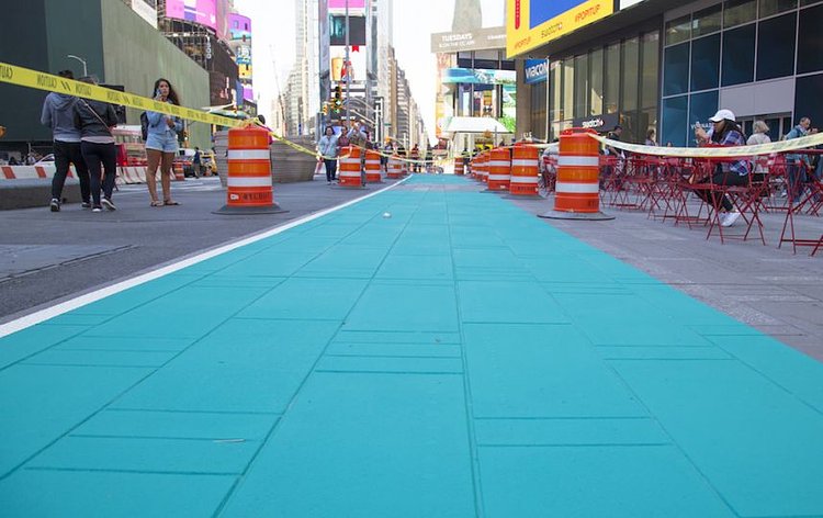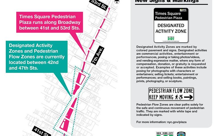 The Designated Activity Zones — targeted for commercial activities including the costumed and painted solicitors — are painted teal and measure 8 feet by 50 feet. Under the new law, these spaces are meant for any sort of entertainment, performances, vending or posing or taking photos for any form of compensation, donation or tip.