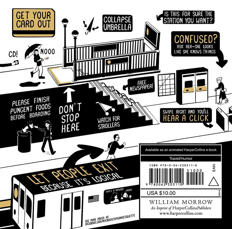 Living in New York City for five years as a transplant from Ohio, illustrator and T-shirt designer Nathan Pyle was fascinated by the unique habits and unspoken customs New Yorkers follow to make life bearable in a city with 8 million people (and seemingly twice the number of tourists). In NYC Basic Tips and Etiquette, Pyle reveals the secrets and unwritten rules for living in and visiting New York including the answers to such burning questions as, how do I hail a cab? What is a bodega? Which way is Uptown? Why are there so many doors in the sidewalk? How do I walk on an escalator? Do we need be touching right now? Where should I inhale or exhale while passing sidewalk garbage? How long should I honk my horn? If New York were a game show, how would I win? What happens when I stand in the bike lane? Who should get the empty subway seats? How do I stay safe during a trash tornado? Each tip is a little story illustrated in simple black and white drawings.