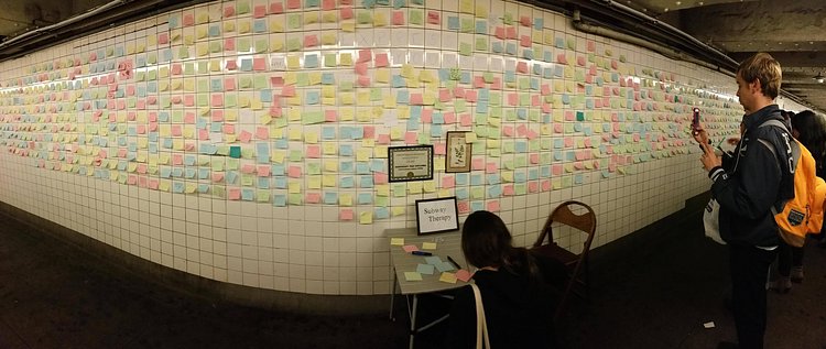 Artist Levee behind the performance art piece Subway Therapy has setup a booth in the underpass between the 1 train and the L train at the 14th Street stop in which depressed New Yorkers can post inspirational notes to help overcome the frustration from this election cycle. So far there have been thousands of notes posted.