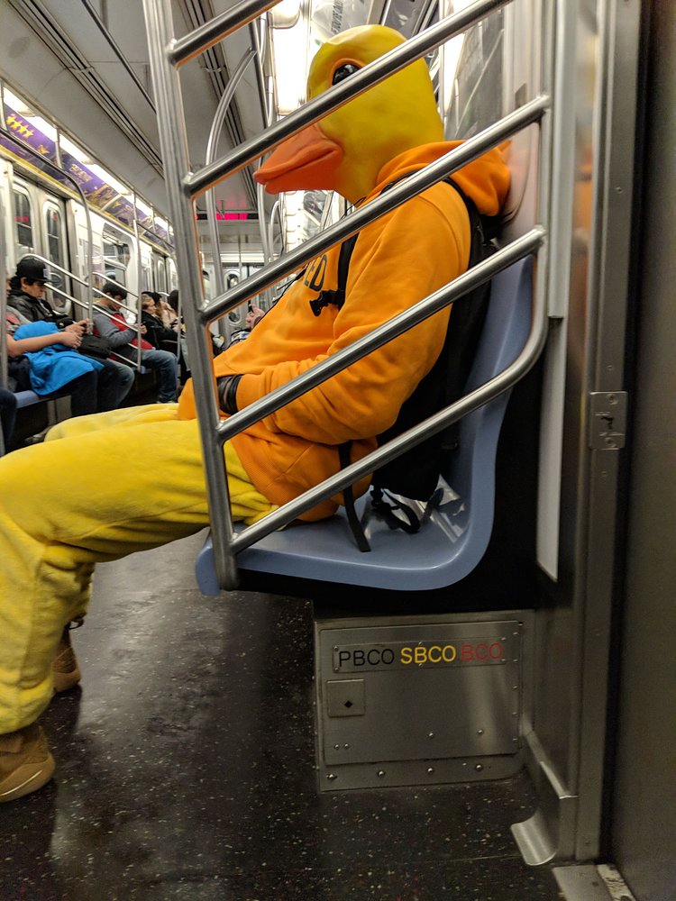 Well technically not a giant chicken costume, but at least he's decked out in all yellow! Spotted on the 7 Train by redditor clashrules.