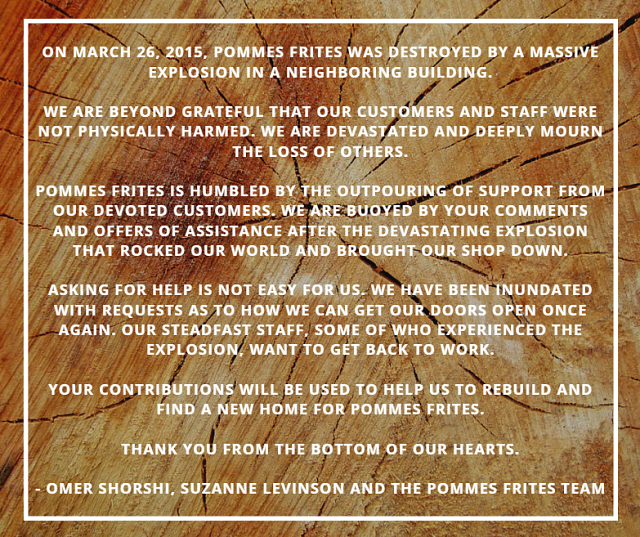 Pommes Frites is now turning their patrons for help rebuilding in a new location. If you want to help, you can donate to Pommes Frites directly using Square Cash.