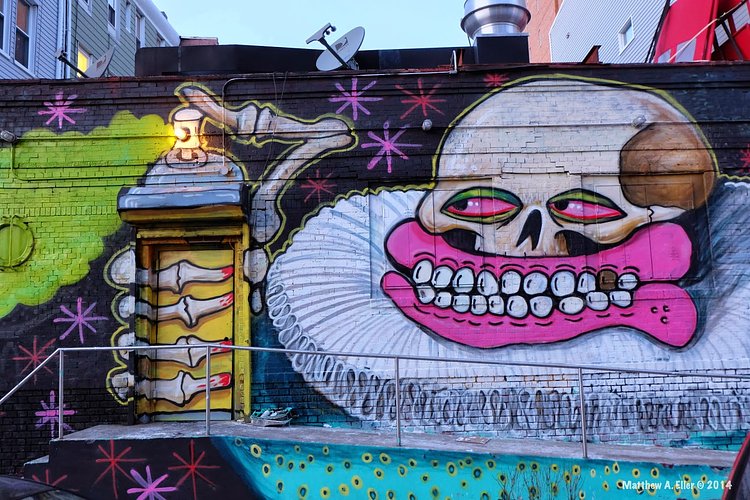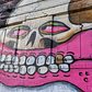 Derailed show in the Brooklyn Naval Yards' Pandemic Gallery, and now he is back with a large mural in Williamsburg. Aside from this mural including his iconic pink, toothy smile, the piece is notable due to the way he incorporated the light over the door into the top of the paint can, making it appear to glow when on.