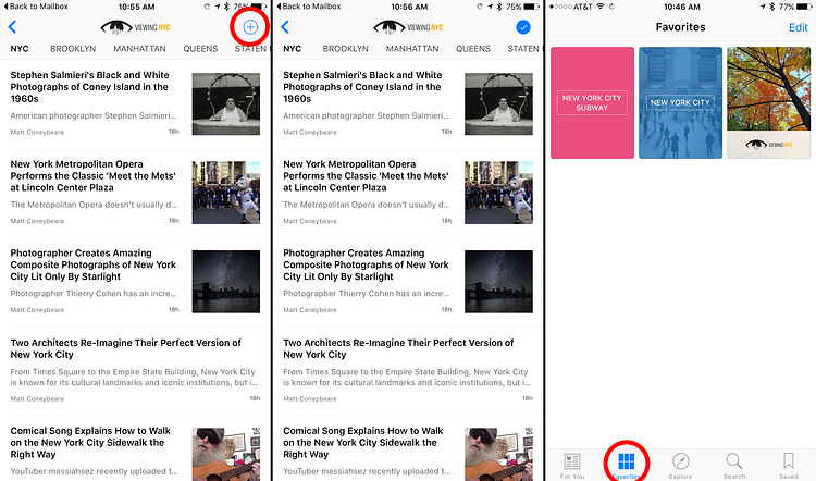 1. Open the Apple News app on your device 2. Tap the Search tab on the bottom of the screen 3. Type Viewing NYC into the search box 4. Tap the circular plus icon on the right of the Viewing NYC result to add as a favorite