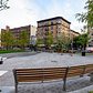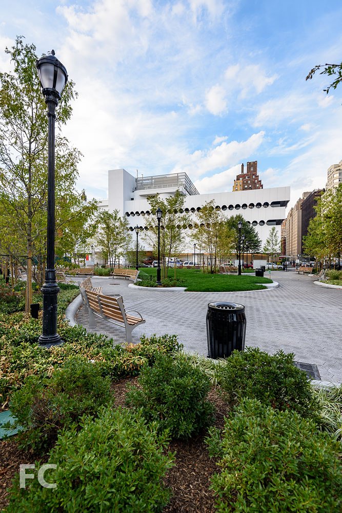 Built as part of the agreement that developers Rudin Management and the Ofer family's Global Holdings, Inc. struck in 2011 to convert the old St. Vincent's Hospital into condos, the triangular park looks about ready to open. Design for the 16,000-square-foot park has been carried out by M. Paul Friedberg & Partners. The northwestern tip of the park will feature the AIDS Memorial, a triangulated canopy designed by Studio a+1.