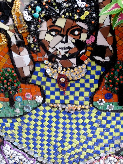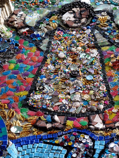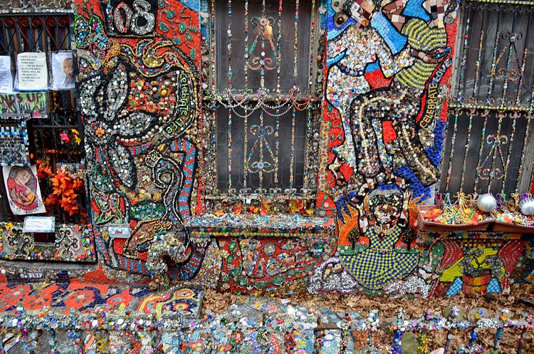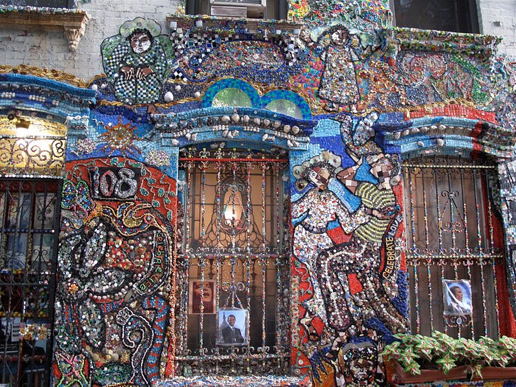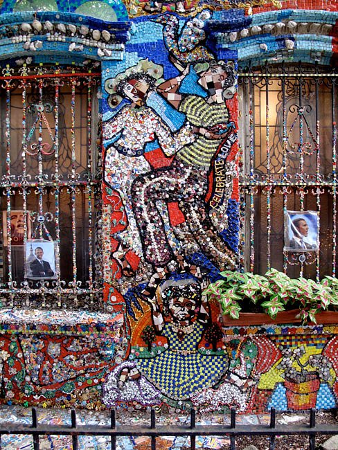 In Brooklyn's Boerum Hill neighborhood, not far off the Bergen Street stop on the F or G line, is an art project many a local has enjoyed for almost 15 years, which all have dubbed "the Mosaic House". Found at 108 Wyckoff Street, the project began a little after the 9/11 tragedy, when artist, and head of the Studio Program at Yeshiva University, Susan Gardner, decided to help cheer up her neighborhood. She began by creating a large mosaic flower, and every summer since, Gardner adds a little more to the facade, in hopes to someday encase her entire brownstone in beads, glass, shells, tiles and buttons. Gardner has claimed the work to be a celebration of life, and it has caught on, as residents of the neighborhood often leave donations of items to be added.