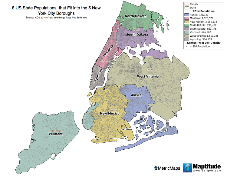 The team at MetricMaps recently put together this cool map showing which U.S. States could fit their entire populations in our City, and what boroughs they would cover.