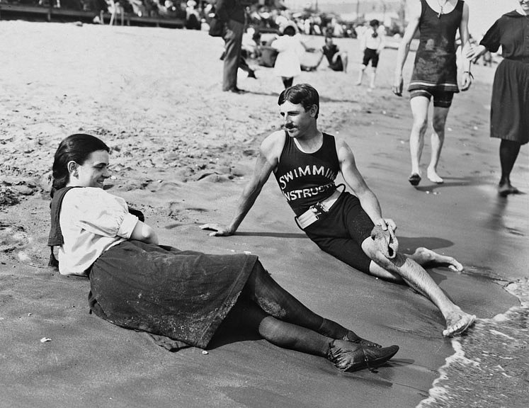 In this vintage photograph captured in 1898 by the Byron Company, we see a young female beachgoer and a swimming instructor laying on the sand, enjoying a conversation.