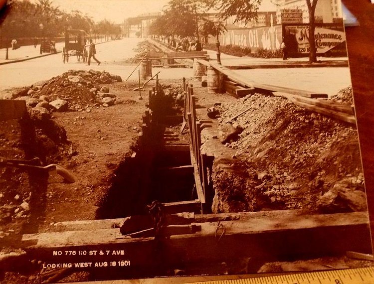 A wonderful photograph on August 10th, 1901, the photographer is looking on the downtown side of the northwest corner in front of subway construction at West 110th Street and 7th Avenue in Harlem, New York.