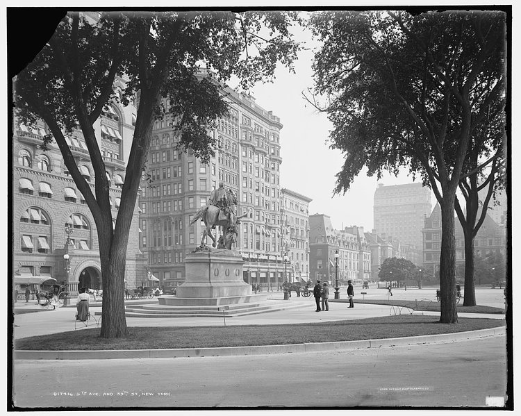 The gilded-bronze statue featured in the plaza is the Sherman Monument honoring American Civil War general William Tecumseh Sherman, dedicated in 1903.