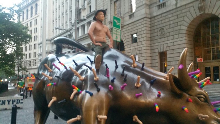 Sometime last night, some pranksters put a shirtless mannequin that is obviously Vladimir Putin on top of Arturo Di Modica's Charging Bull sculpture, along with dozens of rainbow dildos suctioned onto the animal. There's a political/economic/social statement in here somewhere, but I'm just not sure what it is…