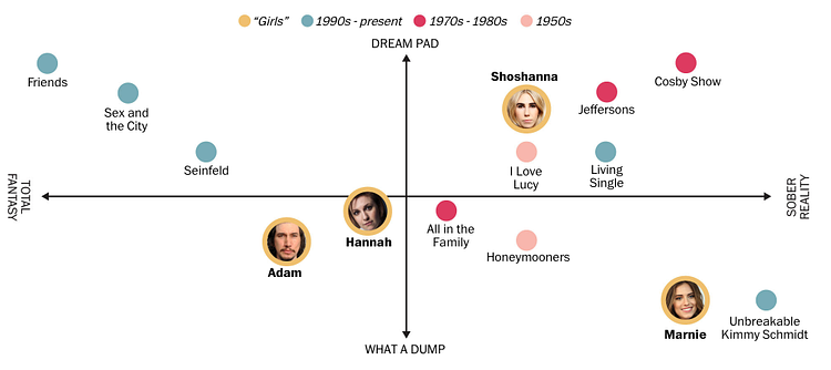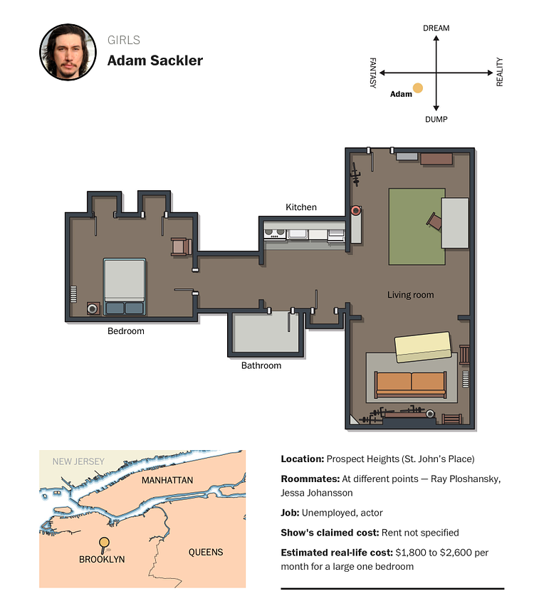 Check out the full article to see more apartment breakdowns like the one for Girls' Adam Sackler above.